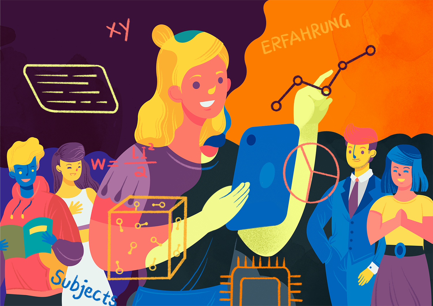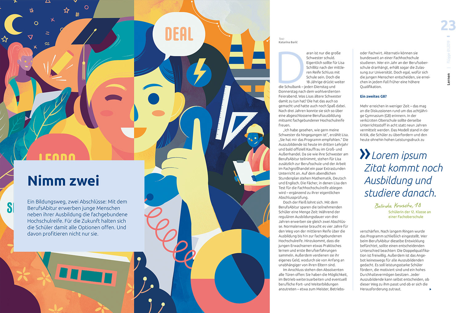 These illustrations were created for Flügge magazine to accompany an article on ‘One Educational Path, Two Qualifications.’ The BerufsAbitur program enables young people to earn a subject-specific higher education entrance qualification alongside their vocational training. This dual pathway keeps all future opportunities open—benefiting not only the students themselves, but society as a whole. The illustrations highlight the positive impact of this evolving approach to the education.